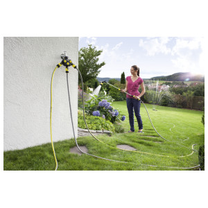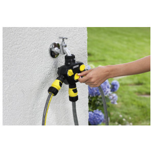 3-smerni razdelilnik s tremi neodvisnimi, posamezno nastavljivimi priključki za vodo omogoča spajanje treh cevi na eni pipi za vodo (priključek za pipo G1, redukcijski nastavek G3/4).Kakovosten trismerni razdelilnik s priključkom za pipo G1 in redukcijskim nastavkom G3/4 za zalivanje z do tremi cevmi hkrati. Trismerni razdelilnik ponuja tri priključke za pipo s tremi neodvisnimi, brezstopenjsko nastavljivimi razpršilniki. Odlikuje ga optimalen pretok vode, pa tudi trpežnost in ergonomska oblika, ki omogoča prijetno in preprosto uporabo. Je vsestransko uporaben v povezavi z vsemi običajnimi vrtnimi cevmi. Slepa matica z robustnim notranjim navojem zagotavlja preprosto in hitro pritrjevanje na pipo za vodo. Trismerni razdelilnik je združljiv z večino dobavljivih sistemov na klik.