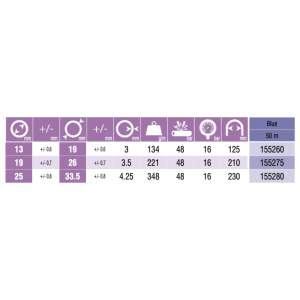 | Šifra | Debelina stene [mm] | Upogibni radij [mm] | Teža izdelka [g/m] | Notranji premer cevi [mm] | Zunanji premer cevi [mm] | Zaloga | Cena | Nakup | Natisni |