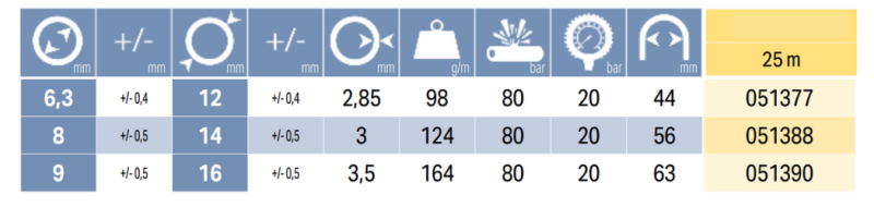 Šifra Debelina stene [mm] Upogibni radij [mm] Teža izdelka [g/m] Notranji premer cevi [mm] Zunanji premer cevi [mm] Zaloga Cena Nakup Natisni