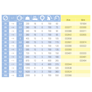 Šifra Debelina stene [mm] Delovni tlak [bar] Dolžina cevi [m] Upogibni polmer [mm] Teža izdelka [g/m] Največji vakuum pri 23°C [mbar] Porušni tlak [bar] Notranji premer cevi [mm] Zaloga Cena Nakup Natisni