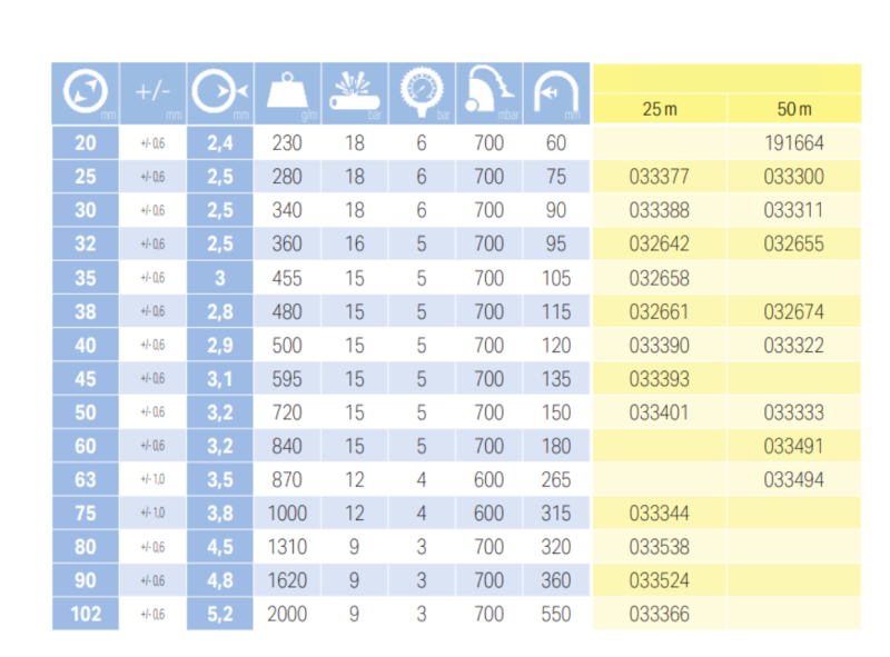 Šifra Debelina stene [mm] Delovni tlak [bar] Dolžina cevi [m] Upogibni polmer [mm] Teža izdelka [g/m] Največji vakuum pri 23°C [mbar] Porušni tlak [bar] Notranji premer cevi [mm] Zaloga Cena Nakup Natisni