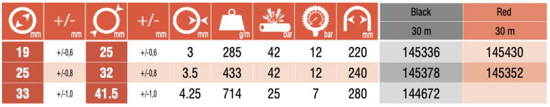| Šifra | Barva | Debelina stene [mm] | Delovni tlak [bar] | Upogibni radij [mm] | Teža izdelka [g/m] | Notranji premer cevi [mm] | Zunanji premer cevi [mm] | Porušni tlak [bar] | Zaloga | Cena | Nakup | Natisni |