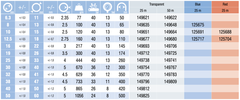 Šifra Barva Debelina stene [mm] Delovni tlak [bar] Upogibni radij [mm] Teža izdelka [g/m] Notranji premer cevi [mm] Zunanji premer cevi [mm] Porušni tlak [bar] Dolžina koluta [m] Zaloga Cena Nakup Natisni