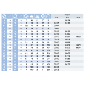 Šifra Debelina stene [mm] Delovni tlak [bar] Upogibni radij [mm] Teža izdelka [g/m] Notranji premer cevi [mm] Zunanji premer cevi [mm] Porušni tlak [bar] Dolžina koluta [m] Zaloga Cena Nakup Natisni