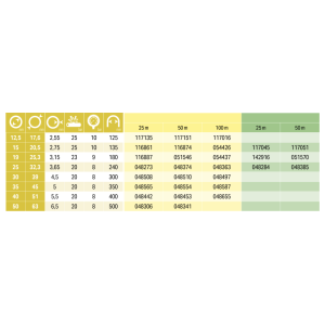 Šifra Barva Debelina stene [mm] Delovni tlak [bar] Dolžina cevi [m] Upogibni radij [mm] Notranji premer cevi [mm] Zunanji premer cevi [mm] Porušni tlak [bar] Zaloga Cena Nakup Natisni