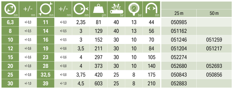| Šifra | Debelina stene [mm] | Delovni tlak [bar] | Dolžina cevi [m] | Upogibni radij [mm] | Teža izdelka [g/m] | Notranji premer cevi [mm] | Zunanji premer cevi [mm] | Porušni tlak [bar] | Zaloga | Cena | Nakup | Natisni |