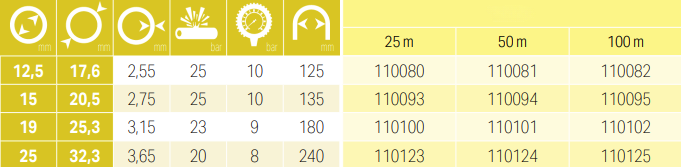 | Šifra | Debelina stene [mm] | Delovni tlak [bar] | Dolžina cevi [m] | Upogibni radij [mm] | Notranji premer cevi [mm] | Zunanji premer cevi [mm] | Porušni tlak [bar] | Zaloga | Cena | Nakup | Natisni |
