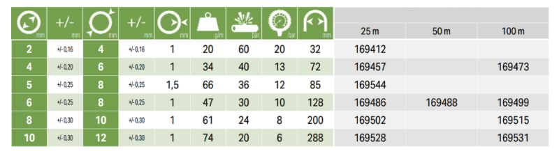 | Šifra | Debelina stene [mm] | Delovni tlak [bar] | Teža izdelka [g/m] | Dolžina cevi [m] | Upogibni radij [mm] | Notranji premer cevi [mm] | Zunanji premer cevi [mm] | Porušni tlak [bar] | Zaloga | Cena | Nakup | Natisni |
