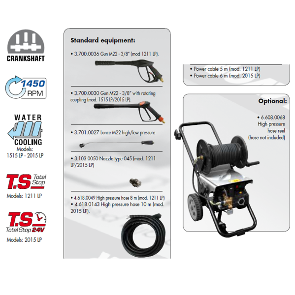 Visokotlačni čistilec (enofazni) z linearno pumpo in vodo hlajenim motorjem omogoča visoko stopnjo zmogljivosti. Regulator pritiska vam nudi prilagajanje za različne potrebe po čiščenju. Priročen ročaj in velika kolesa omogočata enostavno premikanje po vseh terenih. Kolut opcijsko.