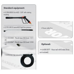 Profesionalni visokotlačni čistilnik s toplo vodo. Zaradi nikljeve linearne črpalke, treh s keramiko prevlečenih batov ter medeninaste glave črpalke, je stroj primeren za delovanje več ur brez prekinitve. Robustno ohišje na štirih kolesih omogoča enostavno premikanje po terenu.