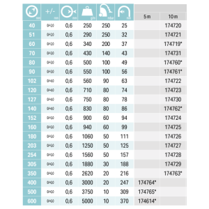 | Šifra | Dolžina cevi [m] | Upogibni polmer [mm] | Največji vakuum pri 23°C [mbar] | Teža izdelka [g/m] | Notranji premer cevi [mm] | Zaloga | Cena | Nakup | Natisni |