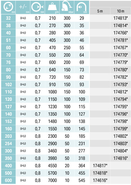 | Šifra | Debelina stene [mm] | Dolžina cevi [m] | Upogibni polmer [mm] | Teža izdelka [g/m] | Največji vakuum pri 23°C [mbar] | Notranji premer cevi [mm] | Zaloga | Cena | Nakup | Natisni |