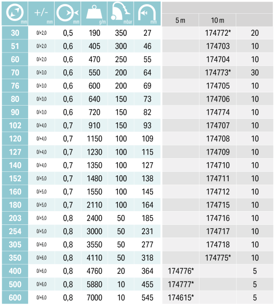 Šifra Debelina stene [mm] Dolžina cevi [m] Upogibni polmer [mm] Teža izdelka [g/m] Največji vakuum pri 23°C [mbar] Notranji premer cevi [mm] Zaloga Cena Nakup Natisni